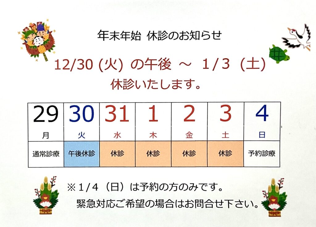 年末年始休診のお知らせ 2025 12/13 お知らせ一覧 診療日のお知らせ 2025年12月13日 誠に勝手ながら、12月31日 水曜日から1月3日 金曜日まで休診とさせて頂きます。 なお、1月4日 日曜日は予約診療のみとさせて頂きます。 休診日の急な歯のトラブルには、休日歯科応急診療をご利用ください。 東京都世田谷区歯科医師会|休日歯科応急診療のご案内 世田谷区歯科保健センター(玉川歯科医師会会立歯科診療所) お知らせ一覧 診療日のお知らせ よかったらシェアしてね! URLをコピーしました! URLをコピーしました!